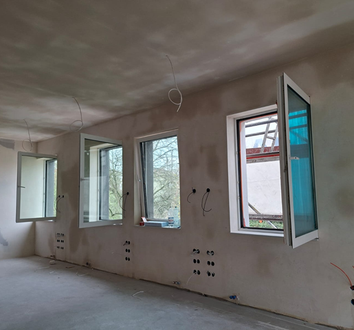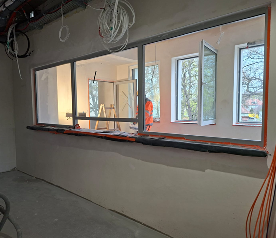 Obecnie prowadzone są roboty wykończeniowe wewnątrz budynku, a jednocześnie kontynuowane są prace związane z zagospodarowaniem terenu wokół obiektu.